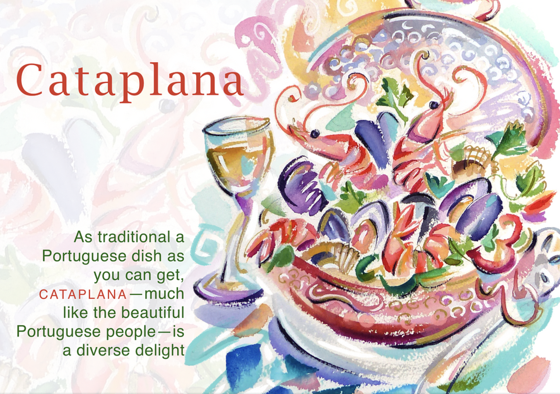 Learn how to make Portugal's iconic cataplana in this colorful, watercolor Portuguese Cataplana e-zine featuring gorgeous kitchen art, the cataplana story, buying tips, and a traditional, lushly-illustrated seafood cataplana recipe. Perfect for Portugal lovers everywhere!